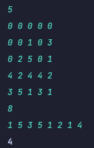 [[0,0,0,0,0],[0,0,1,0,3],[0,2,5,0,1],[4,2,4,4,2],[3,5,1,3,1]] [1,5,3,5,1,2,1,4] 4