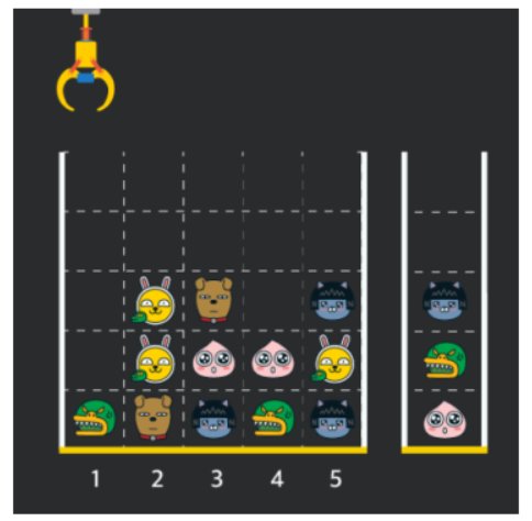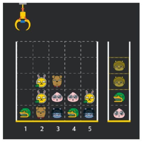 위 상태에서 이어서 [5번] 위치에서 인형을 집어 바구니에 쌓으면 같은 모양 인형 두 개가 없어집니다.