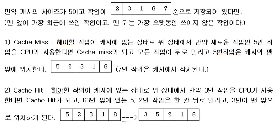 - 캐시의 크기가 주어지고, 캐시가 비어있는 상태에서 N개의 작업을 CPU가 차례로 처리한다면 N개의 작업을 처리한 후