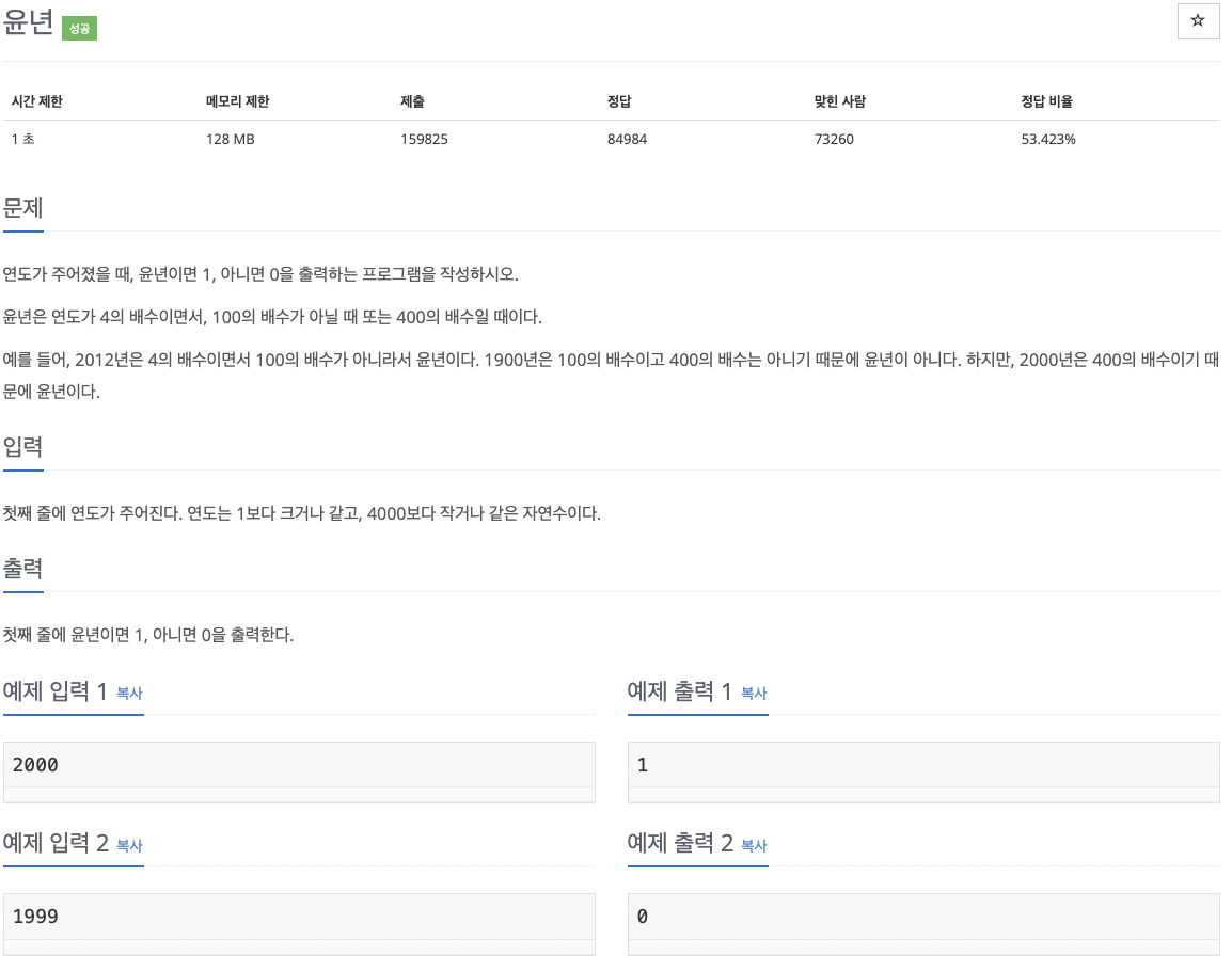 연도가 주어졌을 때, 윤년이면 1, 아니면 0을 출력하는 프로그램을 작성하시오. 윤년은 연도가 4의 배수이면서, 100의 배수가 아닐 때 또는 400의 배수일 때이다. 예를 들어, 2012년은 4의 배수이면서