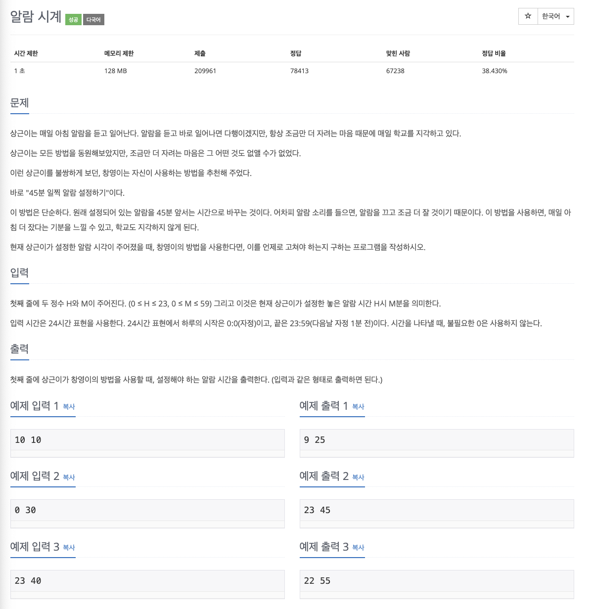 처음에는 H(분)가 45보다 큰지 작은지 조건을 안 걸고 했었는데 예제 입력과 예제 출력이 전부 다 동일하게 나왔었는데 제출에서는 내 코딩이 틀렸다고 나와서 한 5분 정도 멍 때렸다.