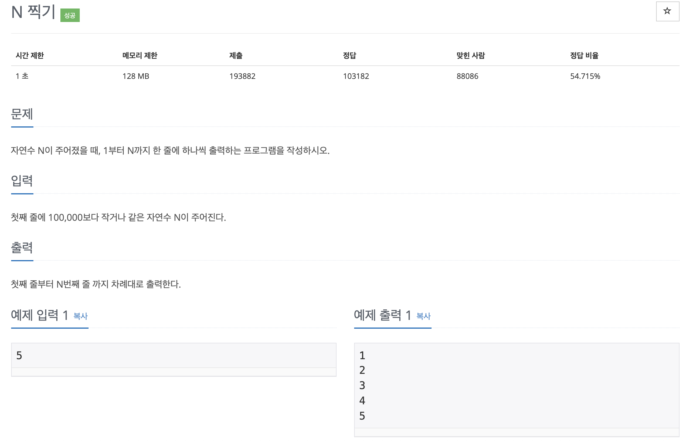 자연수 N이 주어졌을 때, 1부터 N까지 한 줄에 하나씩 출력하는 프로그램을 작성하시오.