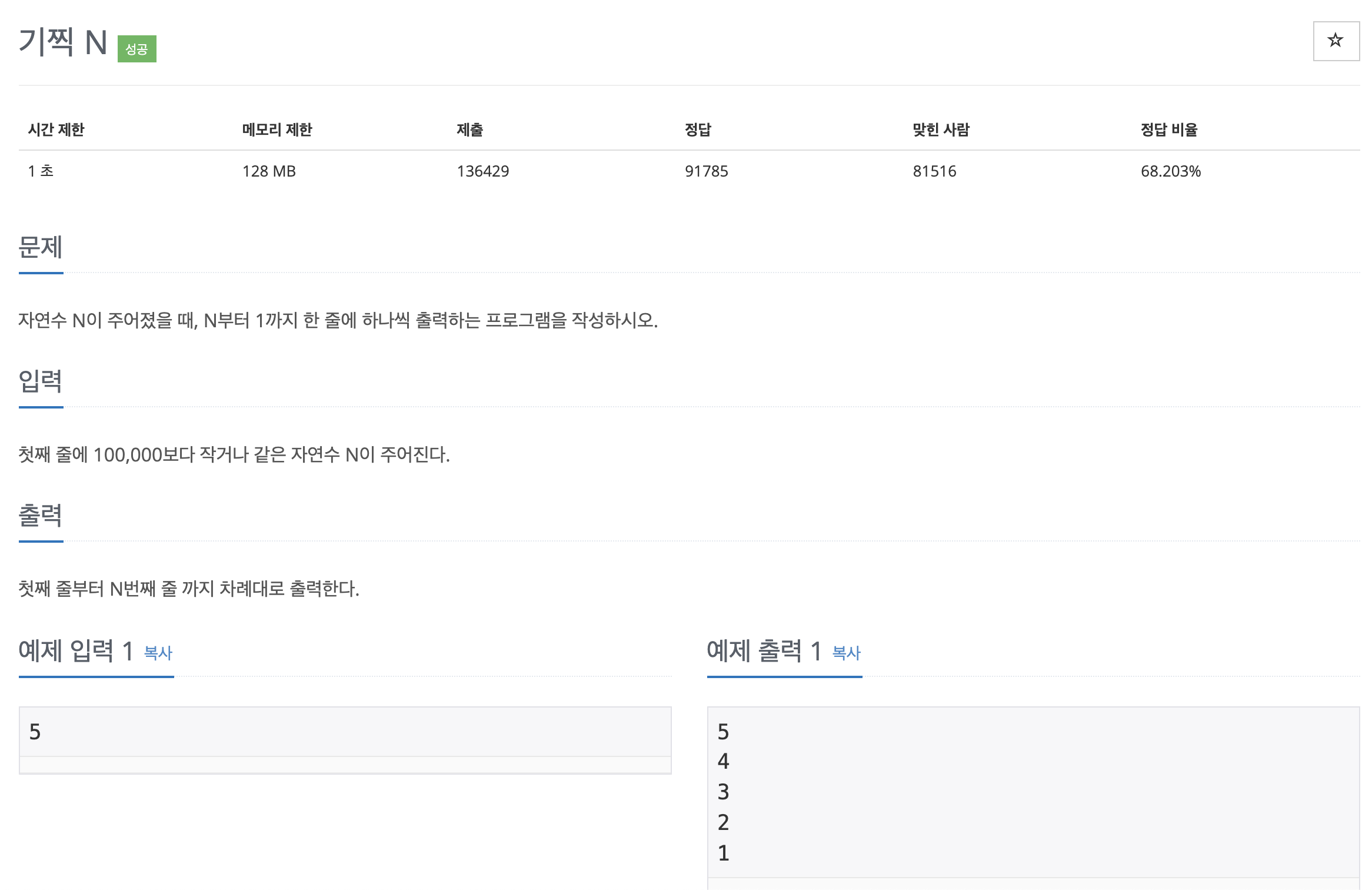 자연수 N이 주어졌을 때, N부터 1까지 한 줄에 하나씩 출력하는 프로그램을 작성하시오.