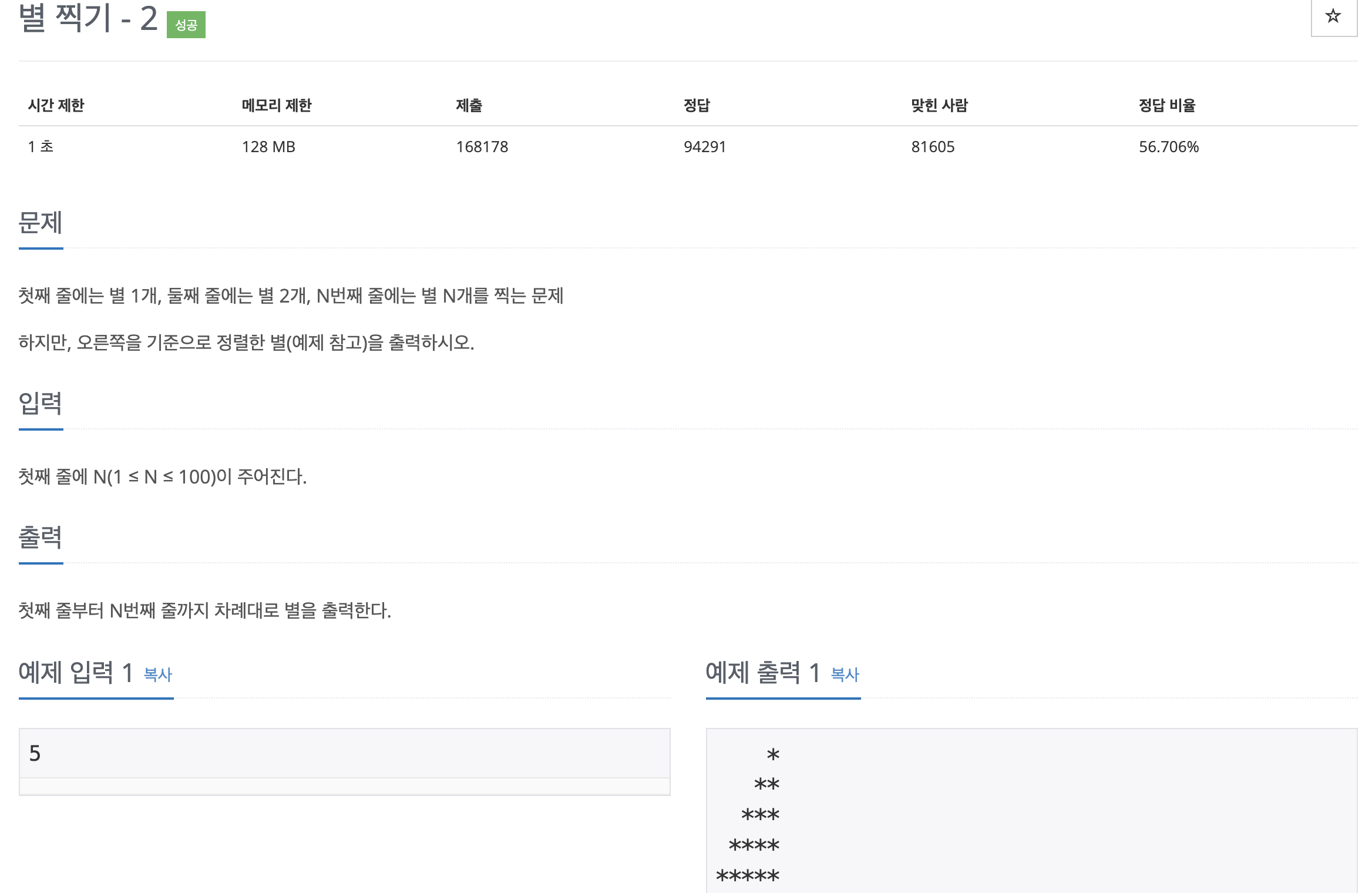 첫째 줄에는 별 1개, 둘째 줄에는 별 2개, N번째 줄에는 별 N개를 찍는 문제 하지만, 오른쪽을 기준으로 정렬한 별(예제 참고)을 출력하시오.