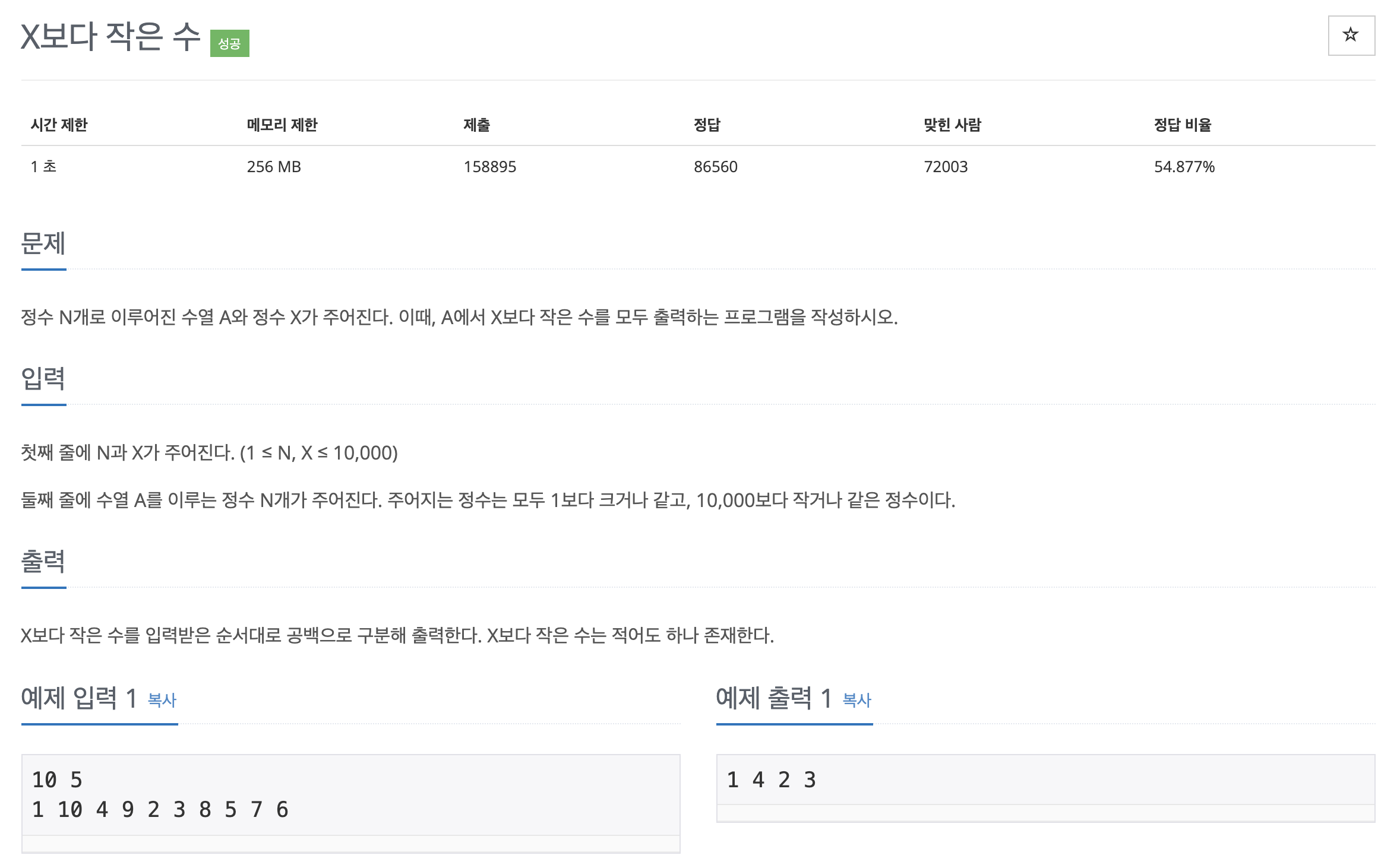 첫째 줄에 N과 X가 주어진다. (1 ≤ N, X ≤ 10,000) 둘째 줄에 수열 A를 이루는 정수 N개가 주어진다. 주어지는 정수는 모두 1보다 크거나 같고, 10,000보다 작거나 같은 정수이다.