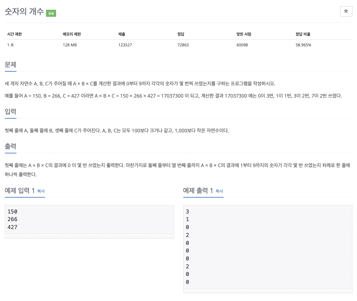 첫째 줄에 A, 둘째 줄에 B, 셋째 줄에 C가 주어진다. A, B, C는 모두 100보다 크거나 같고, 1,000보다 작은 자연수이다.